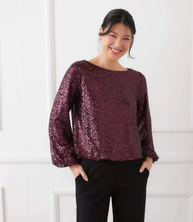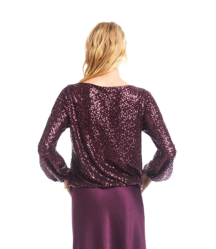 Capture attention in the Baila top by Karen Kane, where rich eggplant meets shimmering sequin mesh for a look that’s both bold and effortless. The wide boatneck neckline and dramatic blouson sleeves create soft structure, while elastic cuffs and hem offer relaxed ease. Fully lined for comfort, this piece is designed to shine—whether styled for celebration or layered into a tonal edit.