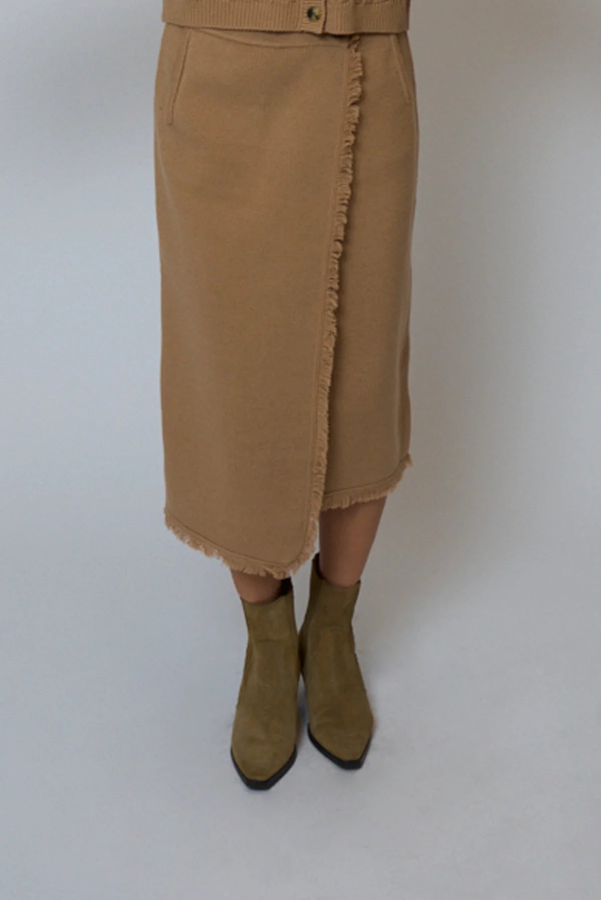 The Elyse Fringe Asymmetrical Midi Skirt by Central Park West brings movement and texture to your fall edit. Crafted in a soft knit with a flattering drape, it features a wrap-style front trimmed in fringe and a comfortable elastic waistband with button detail. It’s a standout piece for layered looks and transitional styling.