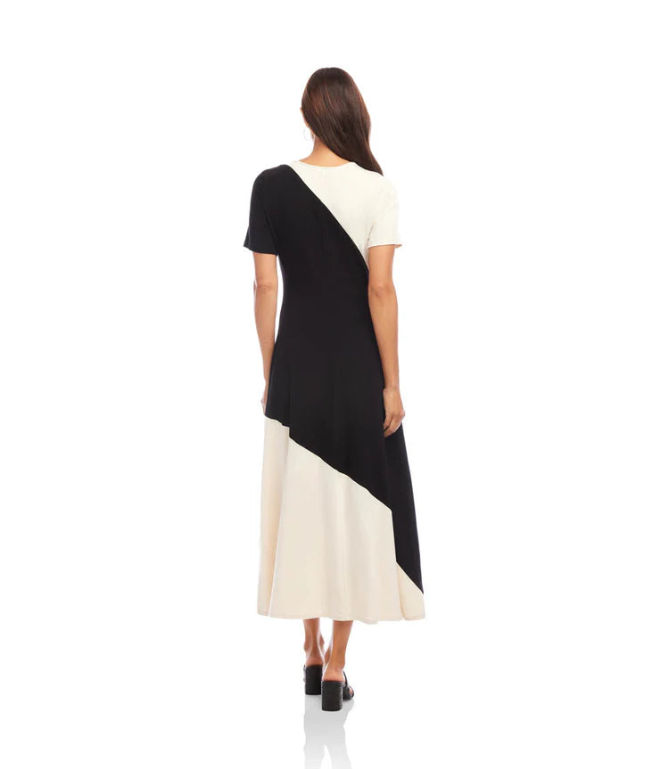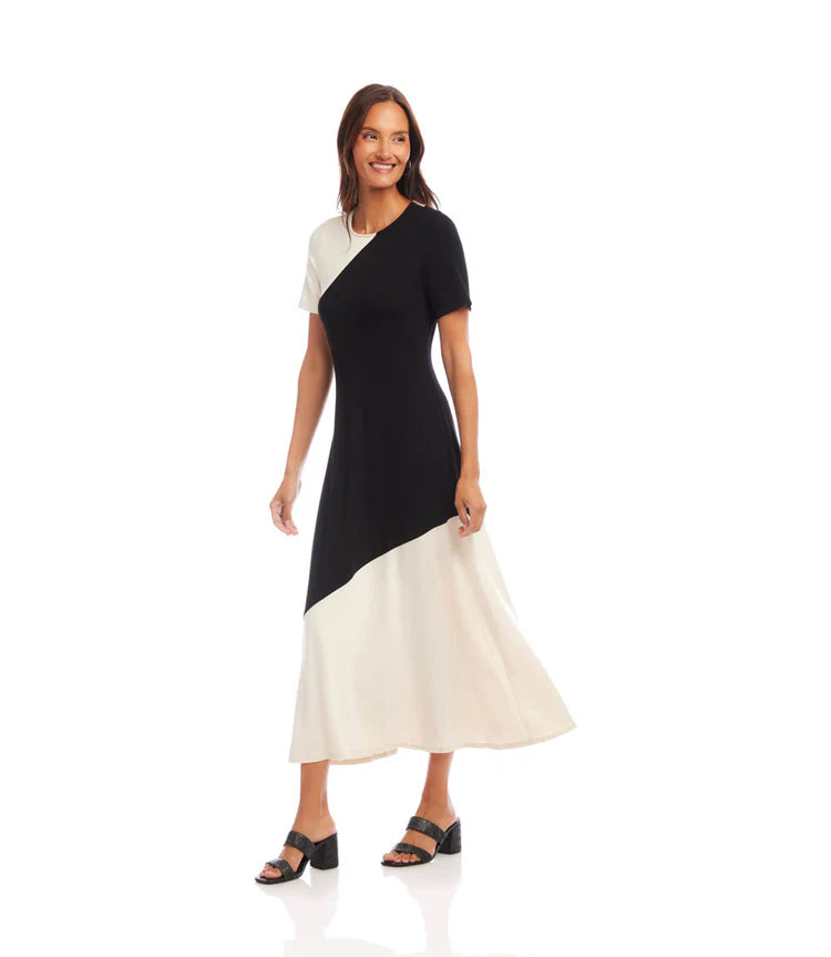 The Shannon Midi Dress delivers sleek sophistication with a modern twist. Designed in soft rayon spandex jersey, it features flattering short sleeves, a clean scoop neckline, and striking contrast colorblocking in ecru and black that contours your silhouette with subtle artistry. The fitted bust and waist gracefully ease into a relaxed skirt, creating a shape that’s effortless yet elevated.