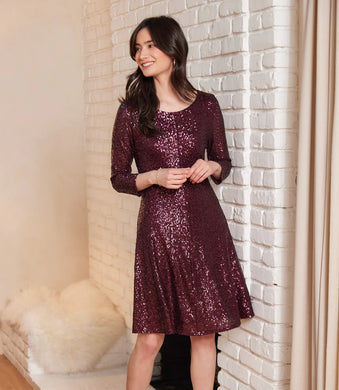 Twyla Three Quarter Sleeve Sequin Scoop Neck Fit & Flare Dress in Eggplant - Karen Kane 3L37511