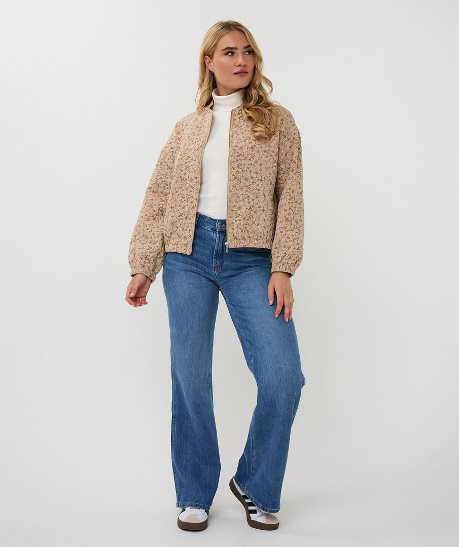 Woman wearing a beige textured bomber jacket and blue jeans against a white background.