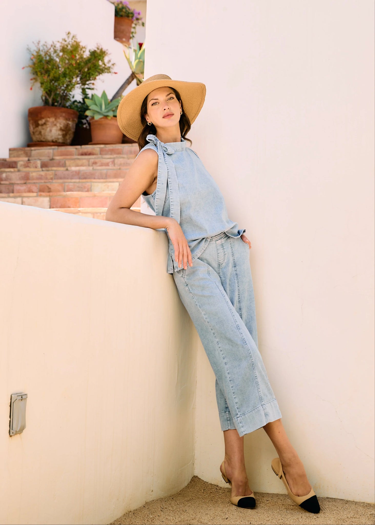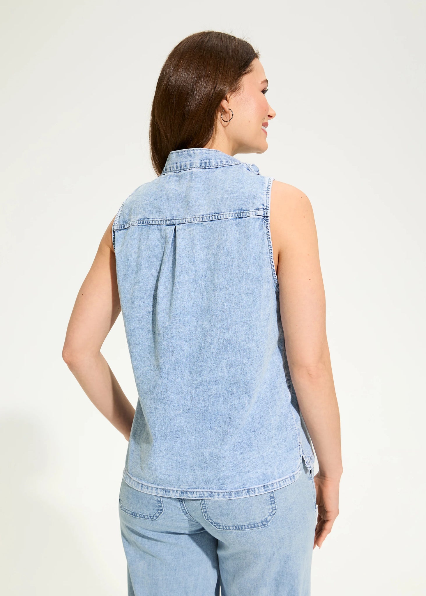 Timelessly chic, this powder wash blue sleeveless blouse features a flattering bow-tie neck, perfect for adding sophistication to any outfit. Whether you're dressing up for a day at the office or a night out, this elegant piece offers effortless style.