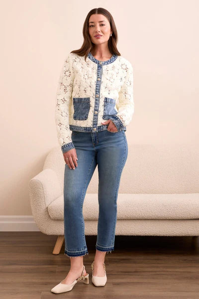 Refresh your layering game with the Maven Mixed Media Crochet Jacket by TRIBAL. This standout piece blends delicate crochet with structured denim inserts for a modern twist on texture. Featuring a straight silhouette, silver-tone buttons, and floral rosette detailing, it offers a flattering fit and breathable comfort. The eggshell hue adds softness, while denim accents at the neckline, cuffs, and pockets bring casual edge. Lightweight and versatile, it’s perfect for transitional styling—from brunch to boutique browsing.