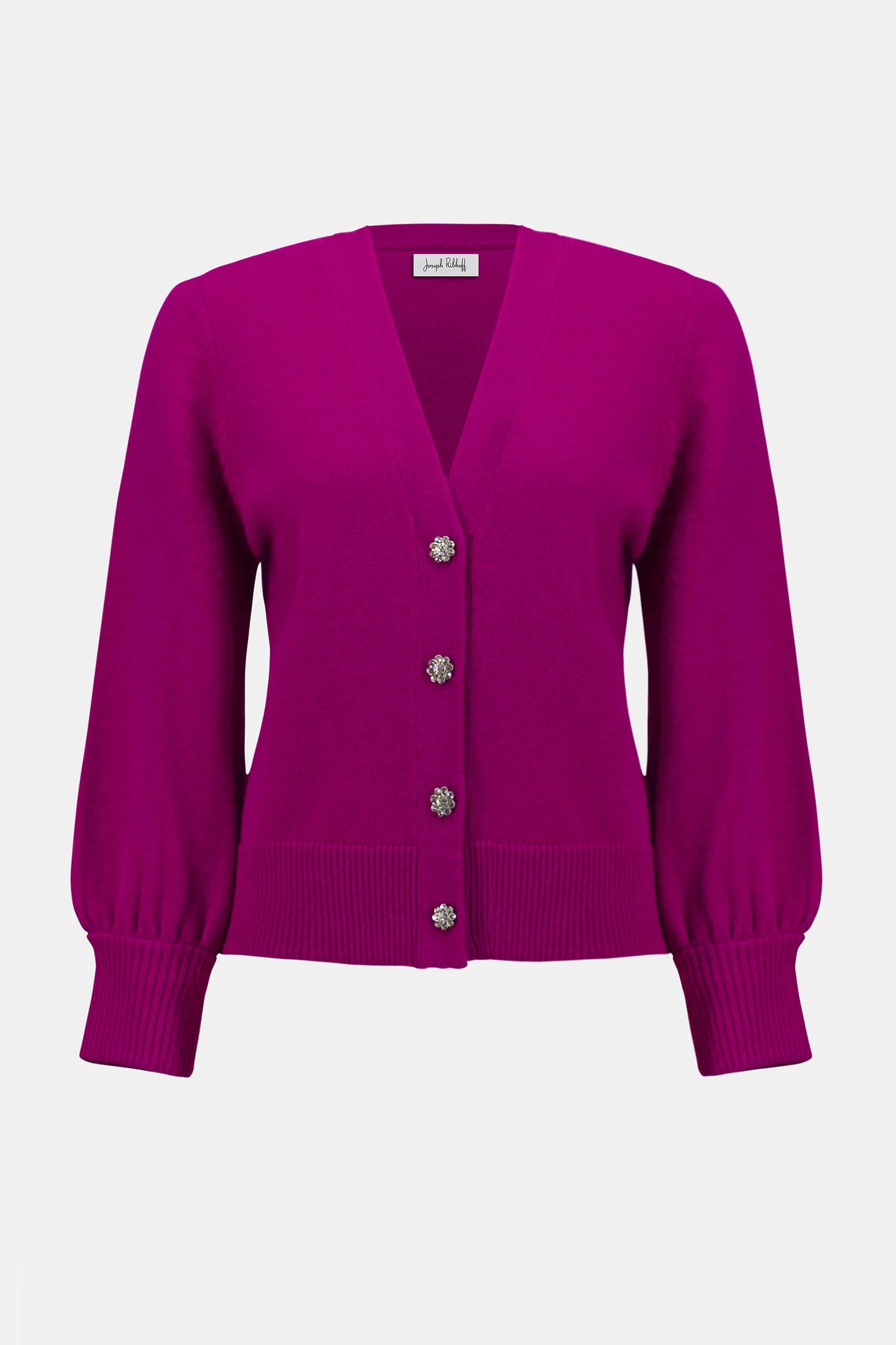 Add a touch of drama to your layering game with the Shona Sweater Knit Cardigan in Cosmos by Joseph Ribkoff. Featuring a flattering V-neckline, voluminous puff sleeves, and dazzling rhinestone buttons, this cardigan blends cozy texture with standout style. Crafted from a soft sweater knit, Shona offers warmth without bulk — perfect for elevating everyday looks or adding sparkle to evening ensembles.