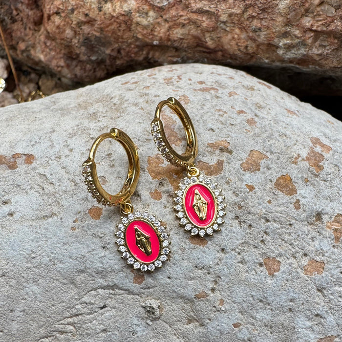 Huggie earrings with pink central stone and gold Virgin Mary surrounded by cubic zirconia against a white background.