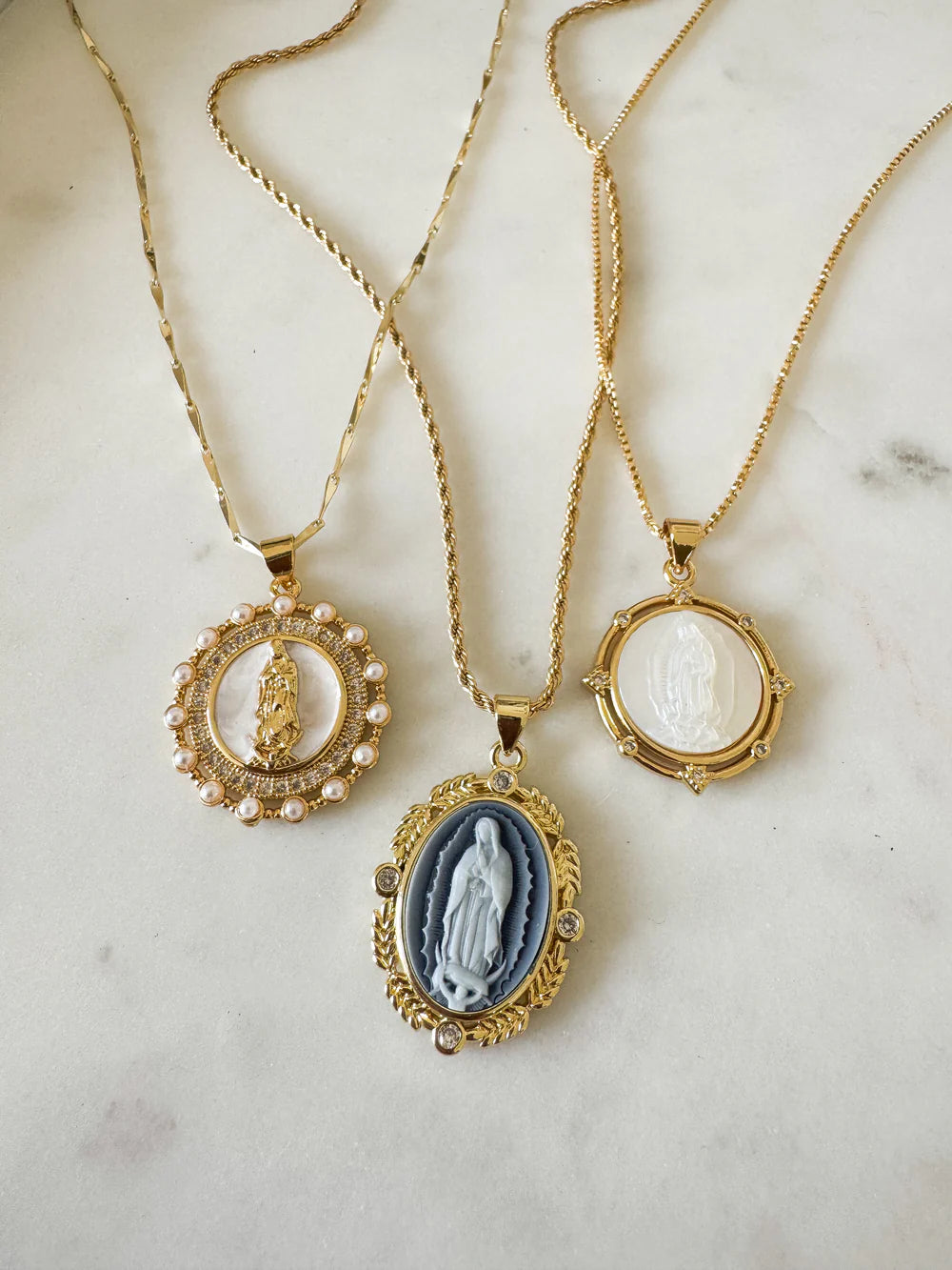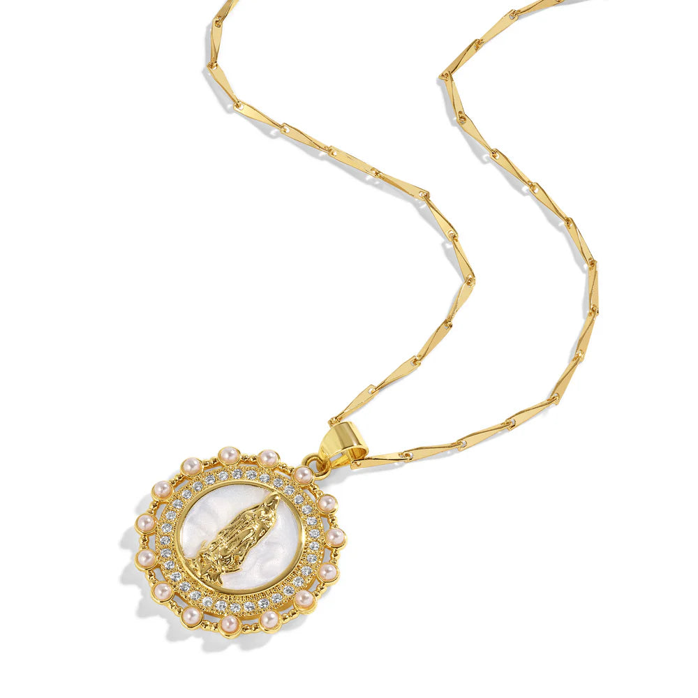 Gold necklace with a round pendant with pearls and crystals surrounding a white pearl shell with a gold Virgin Mary icon against a white background.