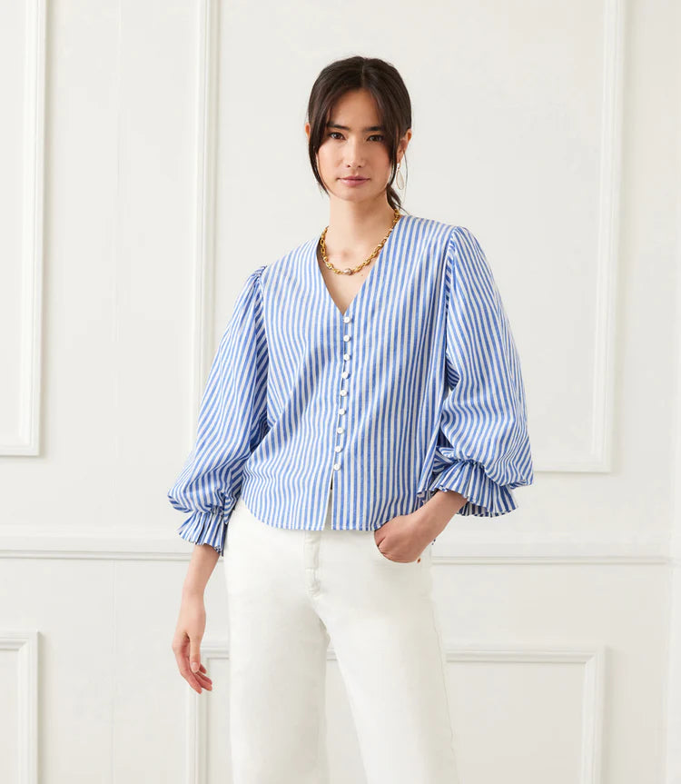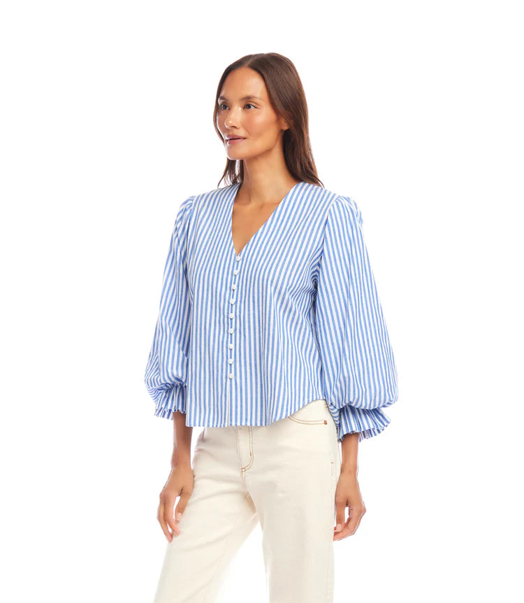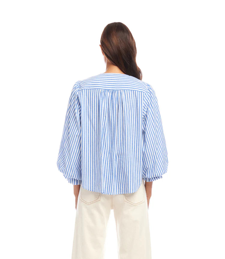 Playfully tailored and effortlessly feminine, the Stripe Layered Sleeve Shirred Blouse by Karen Kane offers texture and movement with a modern twist. Crafted from breathable cotton shirting, this blouse features a soft V-neckline, delicate shell buttons, and eye-catching layered sleeves with ruffle detail and elastic shirring at the cuffs. The blue and white stripe pattern evokes a crisp coastal feel, while the partially lined design keeps things refined yet lightweight.