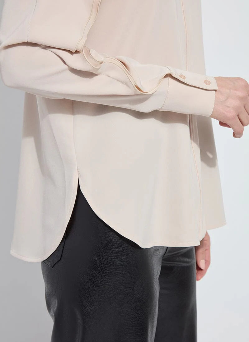 Softly structured and effortlessly feminine, the Isadora Raglan Ruffle Sleeve Blouse blends boutique detail with everyday ease. Crafted from wrinkle-resistant Stretch Woven fabric, it features 2-way stretch, a rounded shirttail hem, and a gently curved collar with cuffed sleeves. The raglan sleeves are artfully constructed from two stitched panels to create a fluid ruffle that moves with you. Designed for beautiful drape and a flattering silhouette, Isadora wears well solo or layered beneath tailored toppers. The Rose Petal hue—a muted taupe pink—adds warmth and versatility.