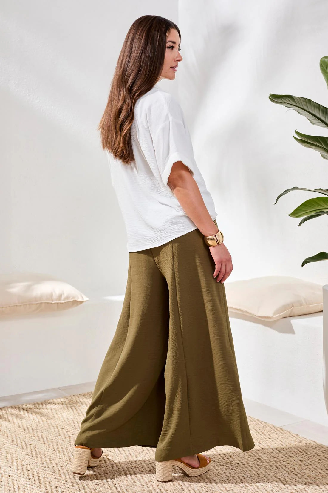Style Tip: Pair these pants with a fitted tank or a tucked‑in blouse to balance the flowy leg. Add a neutral sandal or a crisp white sneaker for a modern, relaxed finish. For a monochromatic moment, layer with soft greens or natural textures.