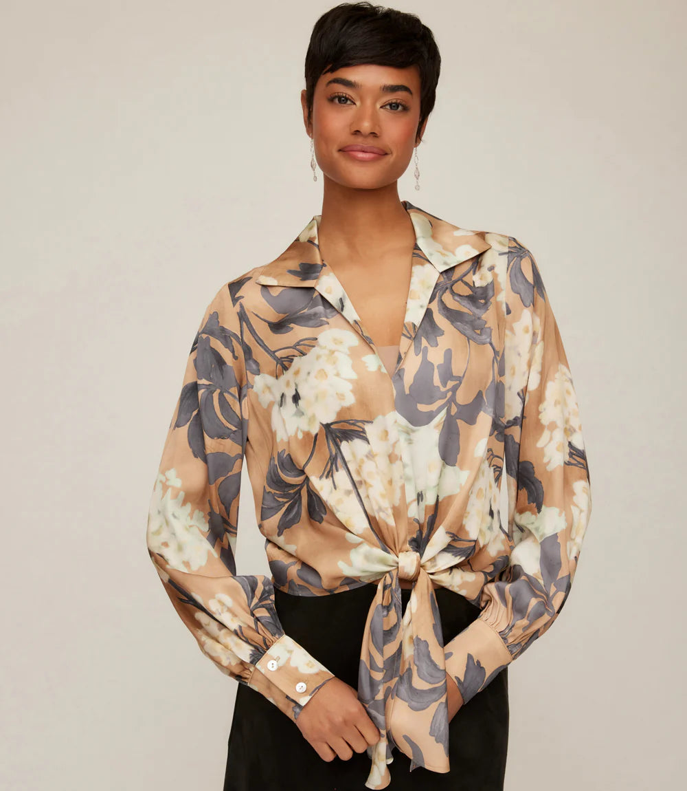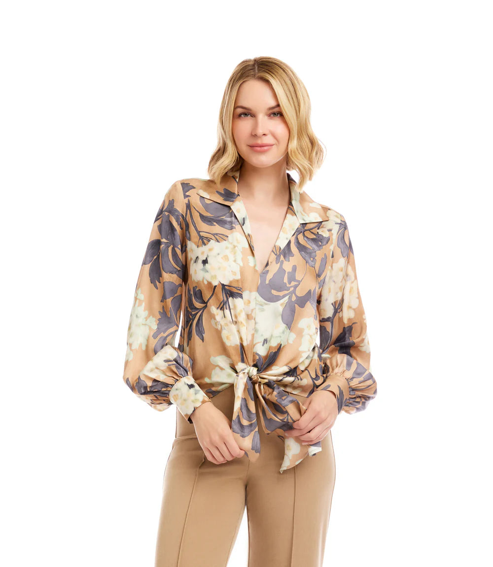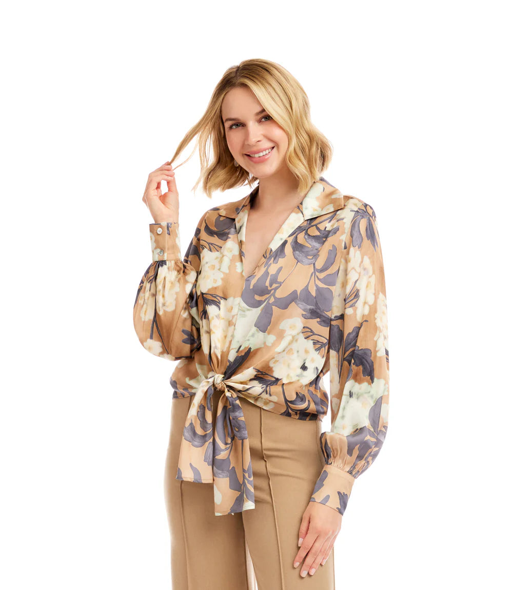 The Karen Kane Blouson Sleeve Satin Tie‑Front Top brings effortless elegance to every wardrobe. Crafted in a lustrous Hydrangea satin floral print with a soft, fluid drape, this blouse blends classic polish with modern femininity. A refined collared neckline, graceful blouson sleeves with shell‑button cuffs, and a flattering tie‑front silhouette create a look that transitions seamlessly from daytime sophistication to evening charm.