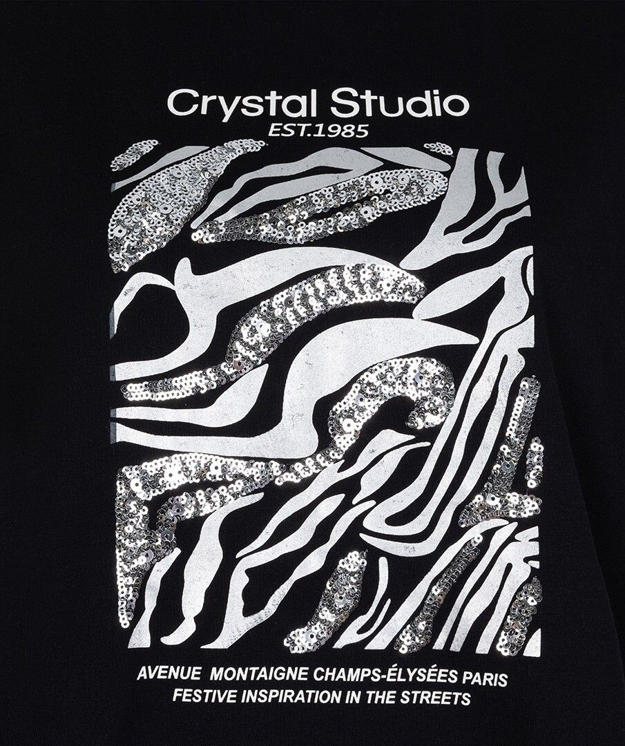 Black t-shirt with white graphic design and 'Crystal Studio' text against a plain background.