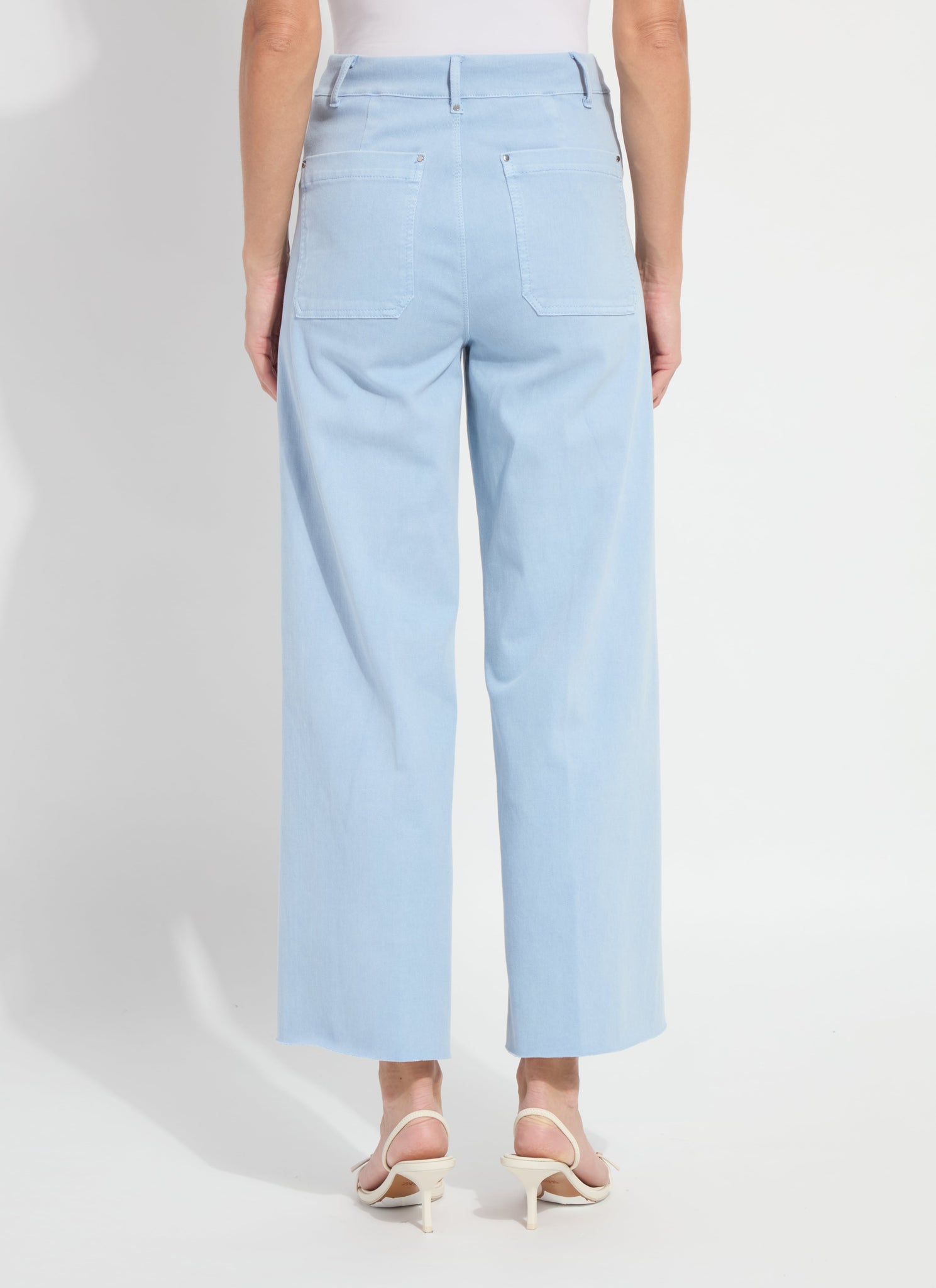 Meet the denim that elevates every spring look. The Erin High Waist Wide Leg Denim smooths and flatters with a concealed patented waistband that shapes comfortably through the waist and hip. Designed with an extra‑wide leg without side seams, this silhouette creates a long, clean line that moves beautifully with the body. Back patch pockets accented with subtle gunmetal studs, belt loops, and refined topstitching add polished detail. A cropped, ankle‑length raw‑edge hem gives the jean a modern finish and can be easily shortened for the perfect fit. Finished in Antique Wash Chalk Blue, this pair brings a fresh, elevated feel to your spring wardrobe.