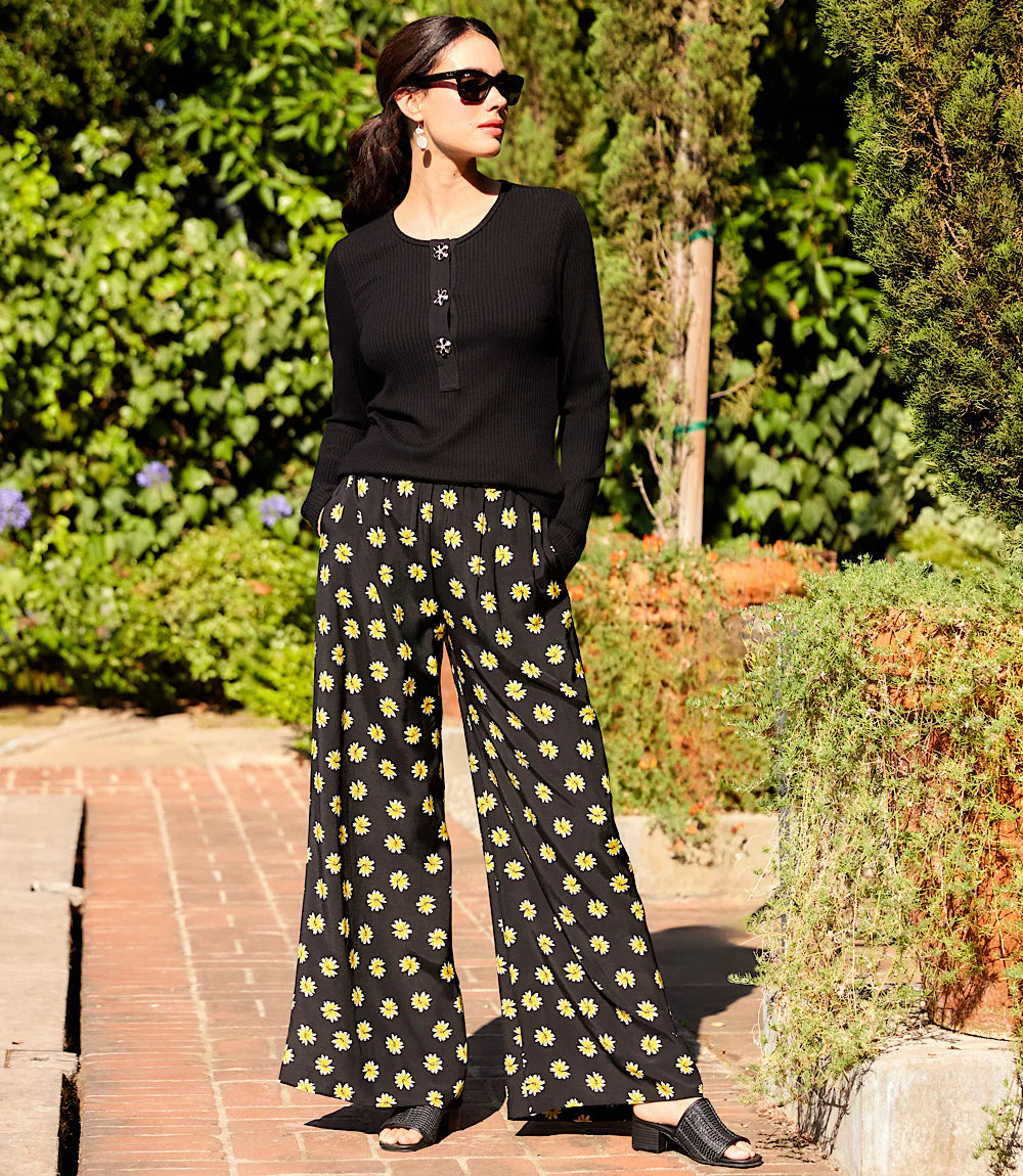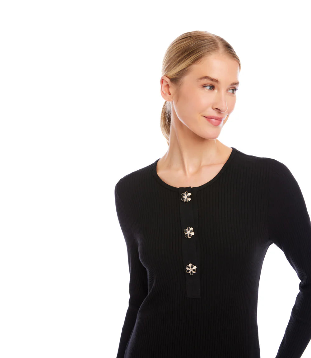 A softly ribbed long‑sleeve top with delicate flower‑shaped button details, the Landry adds a feminine touch to everyday dressing. Its stretchy knit and refined black finish make it an effortless piece for layering, work, or weekend style. Comfortable, polished, and subtly elevated — a signature Karen Kane essential.