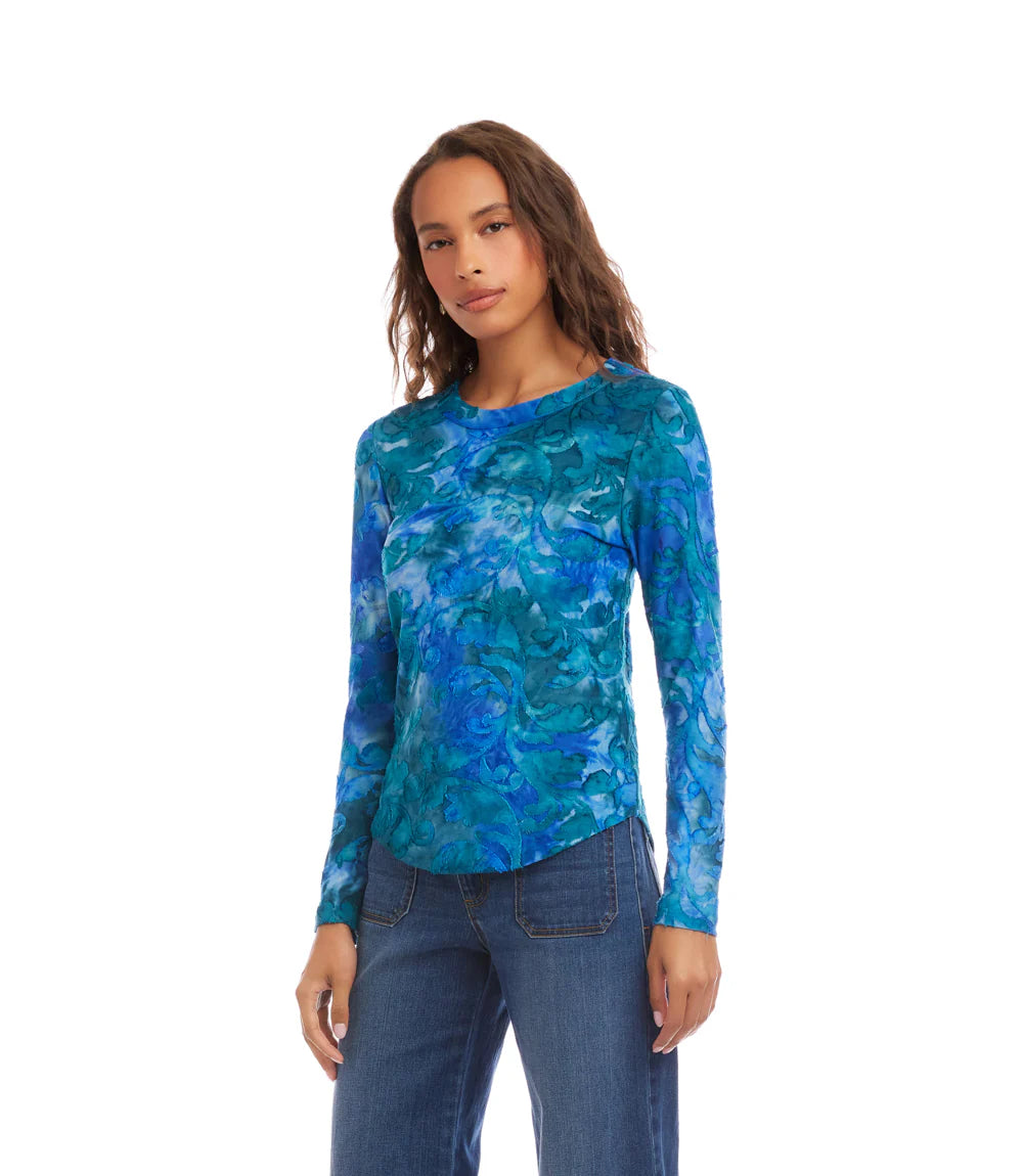 A soft, lightweight burnout knit with a dreamy and vibrant blue tie‑dye finish, this Karen Kane long‑sleeve top brings effortless polish to everyday style. Its relaxed silhouette drapes beautifully, making it an easy, elevated choice for work, weekends, and everything in between.