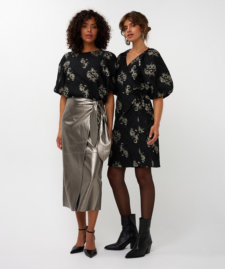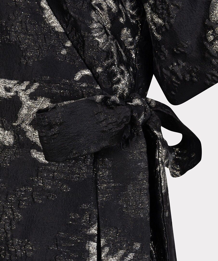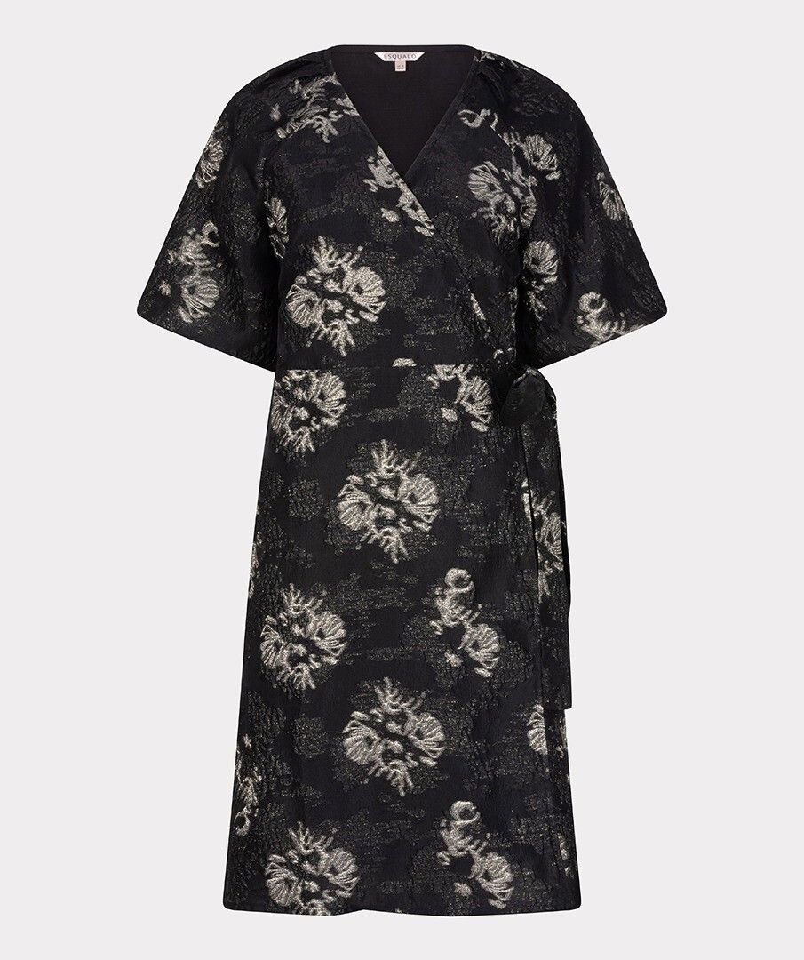 The Esqualo Puff Sleeve Jacquard Dress is a statement piece crafted in black and silver jacquard fabric with a floral abstract pattern. Featuring elegant puff sleeves and a tailored silhouette, this wrap dress blends modern sophistication with timeless detail. Perfect for cocktail parties, holiday gatherings, or evening occasions, the jacquard texture adds depth and luxury while the structured fit ensures comfort and confidence.