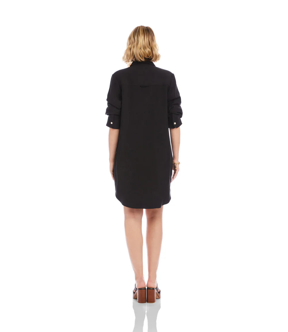 The Riona Ruched Sleeve Shirtdress by Karen Kane blends timeless tailoring with modern ease. Designed in classic black, this polished dress features a crisp collared neckline, button‑front silhouette, and softly ruched sleeves that add feminine structure. Its effortless drape and versatile styling make it a refined go‑to for workdays, dinners, and everything in between.
