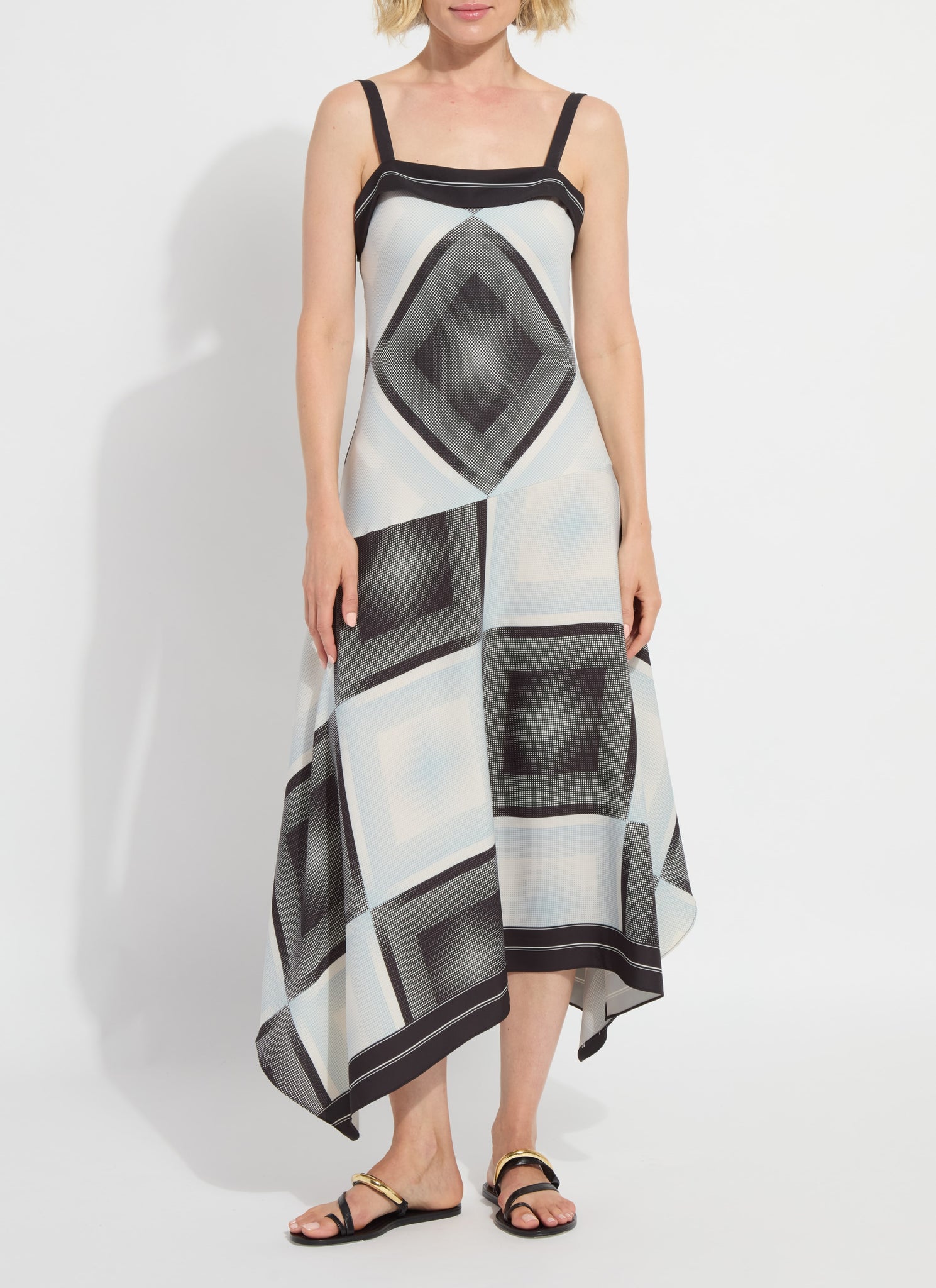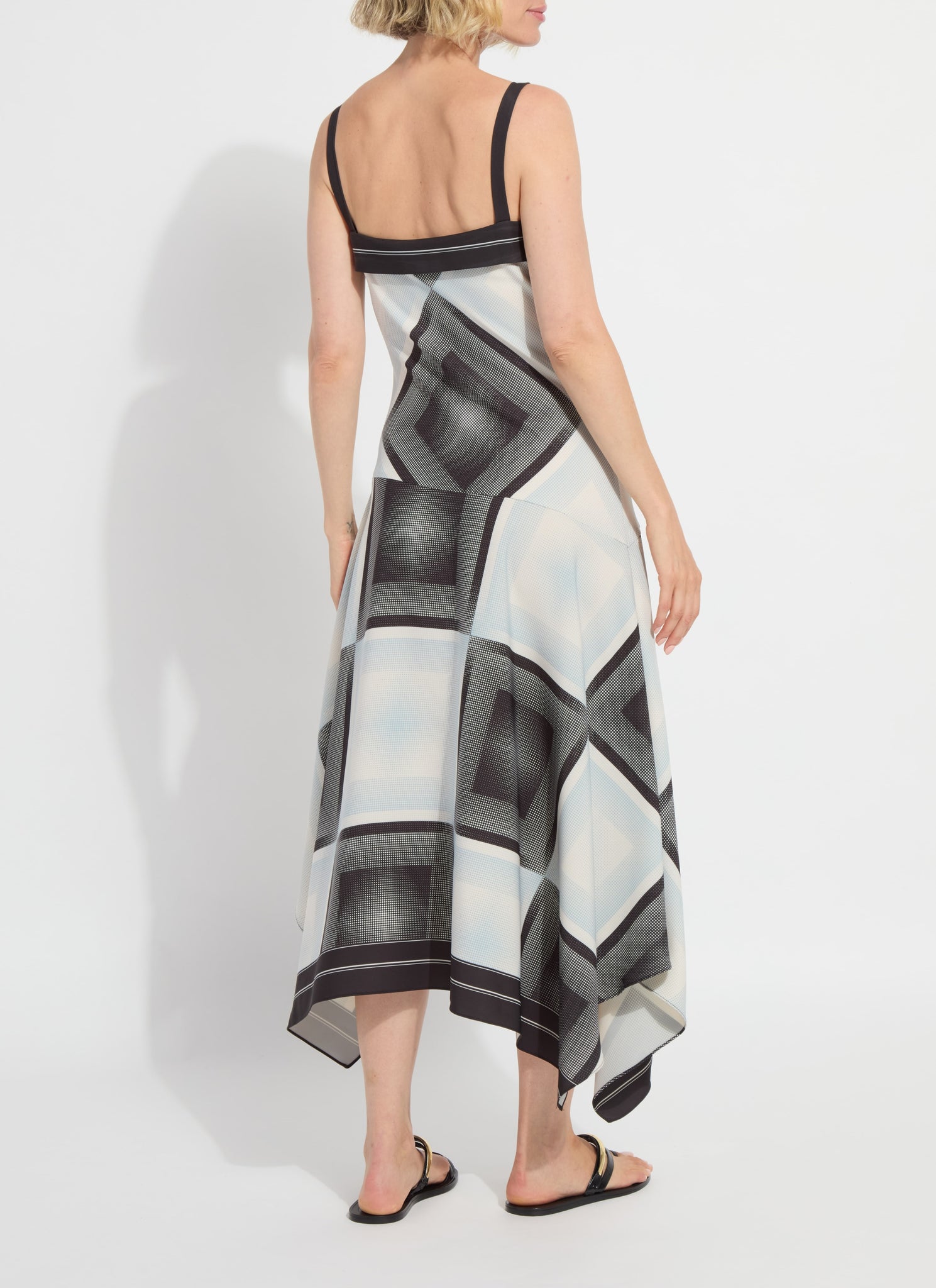 A striking, bias‑cut silhouette with effortless movement. The Lysse Sarai Handkerchief Asymmetric Dress is crafted from wrinkle‑resistant Stretch Woven fabric and showcases a placed print designed in England exclusively for Lysse. Fitted through the top and bra‑friendly by design, it skims the body before opening into a soft, voluminous skirt that moves beautifully with every step. A striped, double‑face band frames the neckline, while the handkerchief hem and two‑way stretch add modern dimension. Adjustable straps make tailoring simple, ensuring a polished, personalized fit.