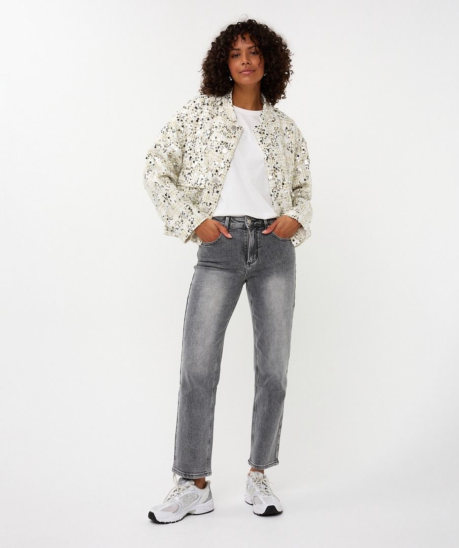 Our Sonja Sequin Bomber jacket by EsQualo includes tweed fabric interwoven with glittering lurex and decorated with sequins in various sizes. This statement piece combines a soft off‑white base with shimmering silver accents, creating a chic balance of texture and sparkle. It’s the perfect jacket to elevate holiday parties or stylish daytime looks.