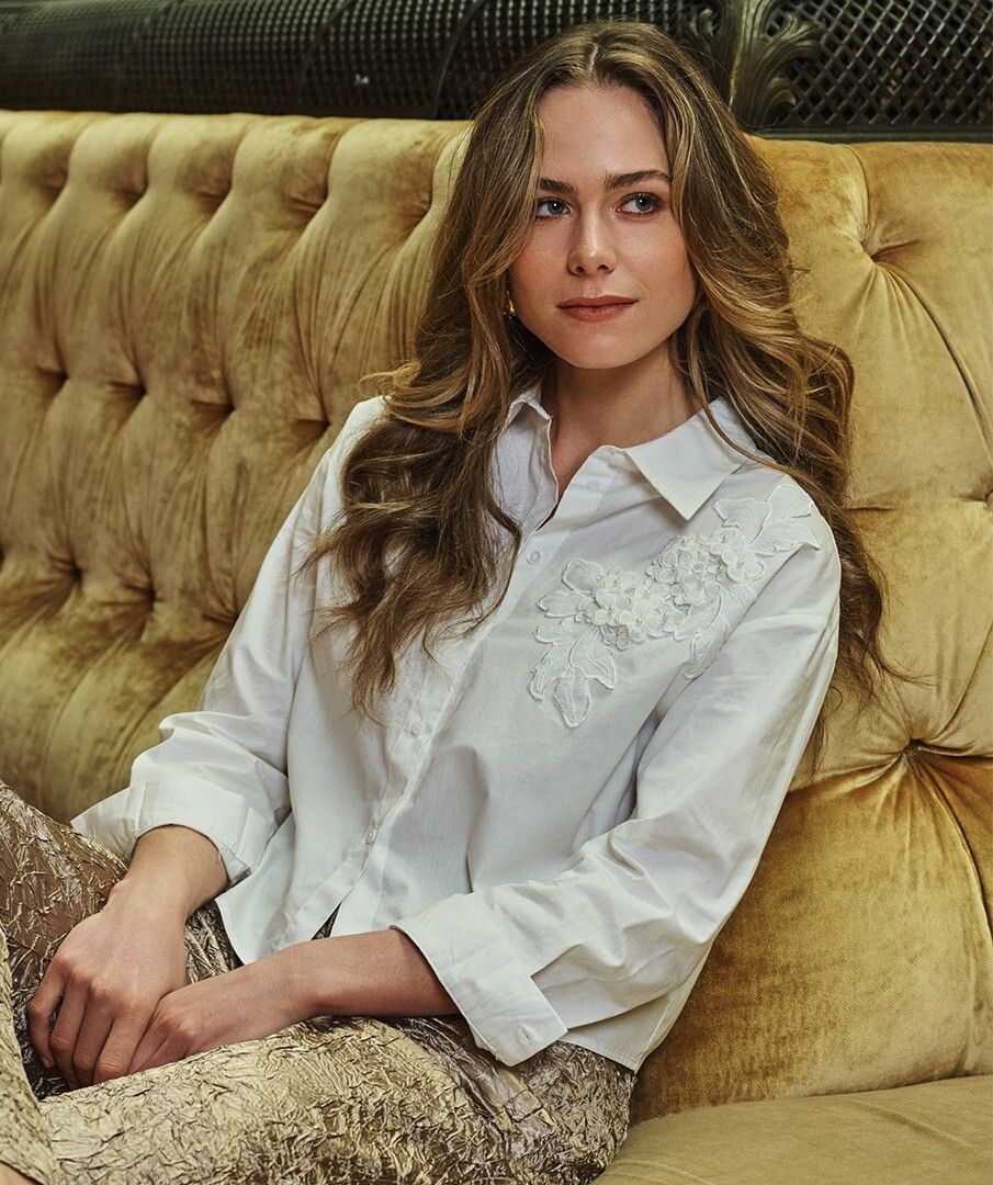 The EsQualo Sahra Small Flower Patch Blouse in Off-white is a refined staple designed for women who appreciate detail and versatility. Crafted in soft cotton with a lapel collar and long sleeves, its delicate floral patchwork adds subtle charm without overwhelming the silhouette. This blouse transitions seamlessly from polished daytime wear to chic evening styling.
