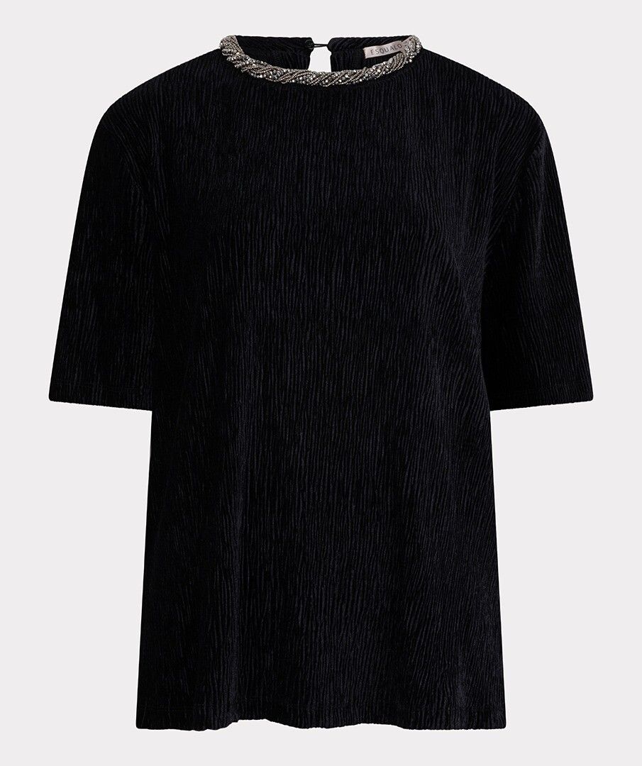 Style Tip: Let the silver‑beaded neckline shine by pairing this top with simple earrings and a sleek bottom. Style with the matching Tinna Trousers Velours Plisse - EsQualo W2530717 (pictured) for a chic monochrome set or elevate it with dark denim and a heeled boot for an evening‑ready look.