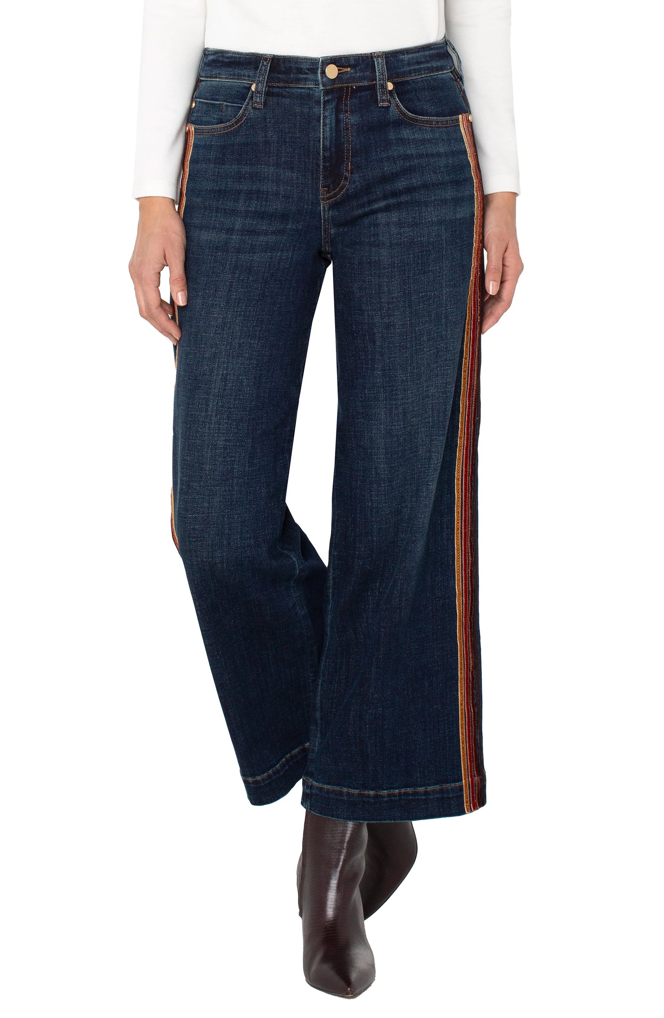 Make a statement in every stride with the Stride Wide Leg Jean in Eastmoor by Liverpool Los Angeles. This mid-rise silhouette features a 28" inseam, wide leg, and rich velvet side trim for a luxe, vintage-inspired finish. Crafted from soft crosshatch denim with 5-pocket styling, a zip fly, and belt loops, it blends structure with elevated ease.