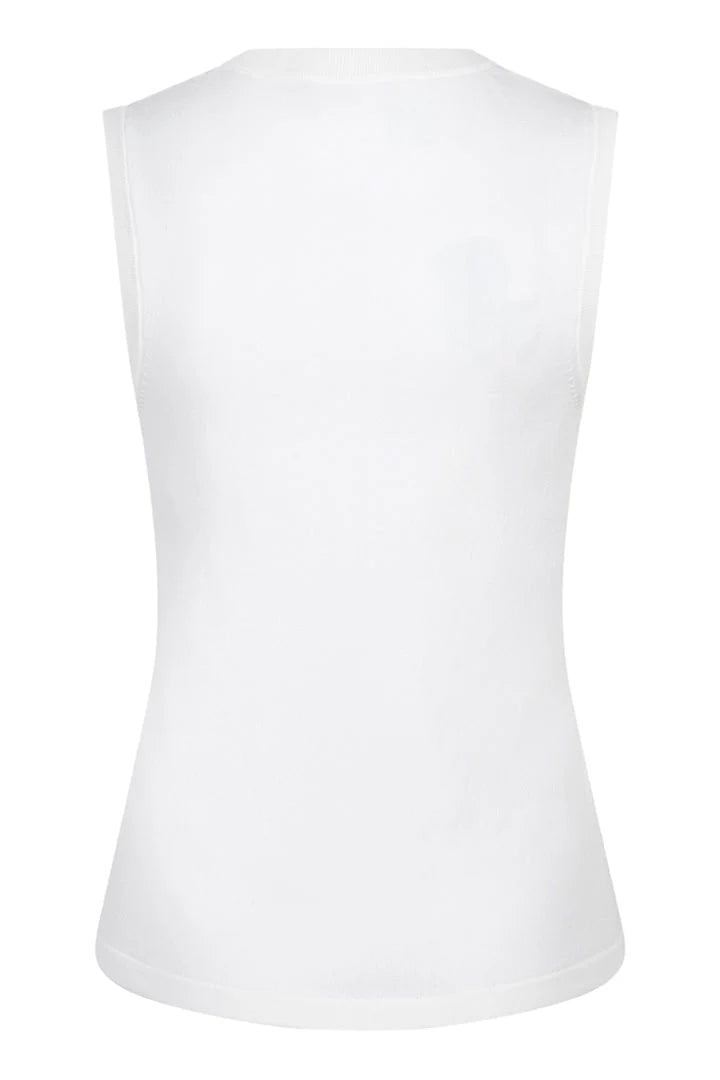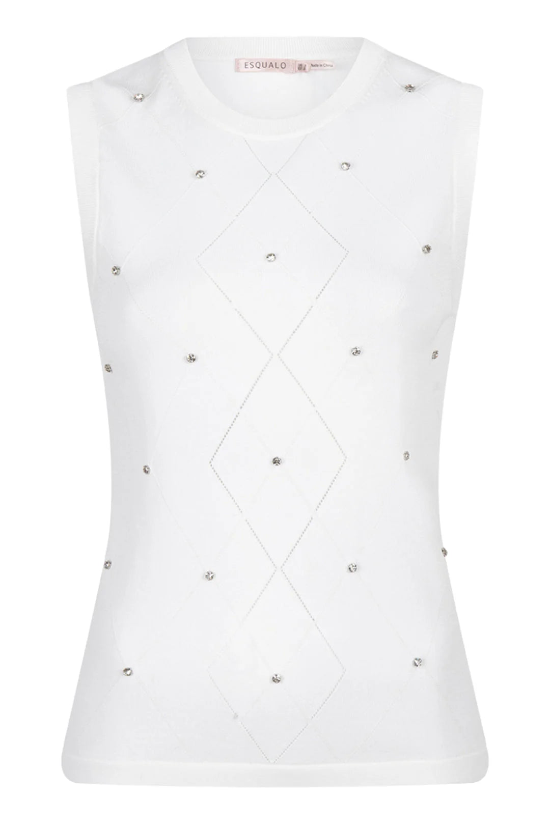 Our Salli Sleeveless Knit Sweater with Embellishments by EsQualo is a sophisticated sleeveless lightweight sweater featuring a delicate diamond pattern with subtle sparkle embellishments. This elegant knit top is designed for versatility, making it perfect for layering or wearing on its own.