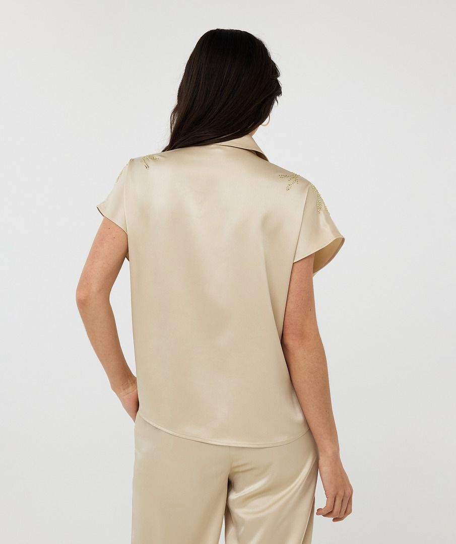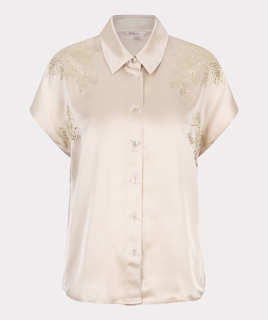 Add instant shine to your wardrobe with this radiant button-down blouse by EsQualo. Designed in a champagne hue with allover micro-sequin embellishment, the Signe Blouse features a relaxed batwing sleeve, classic shirt collar, and button-down silhouette that’s both polished and playful. Whether you’re styling it open over a tank or buttoned up with high-rise trousers, this versatile piece brings a modern twist to glamour.