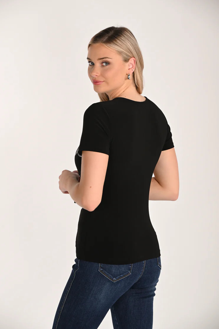 Illuminate your wardrobe with the Frank Lyman Seraphine Short Sleeve Sequin Floral Top, a statement piece that blends artistry, shimmer, and modern elegance. Set against a sleek black backdrop, this top features intricately placed sequin florals that catch the light beautifully, creating a dimensional, luxe finish. The refined silhouette is complemented by a sequined zipper closure, adding a polished, modern touch that enhances both function and design. Perfect for evenings out, special occasions, or elevating tailored separates.