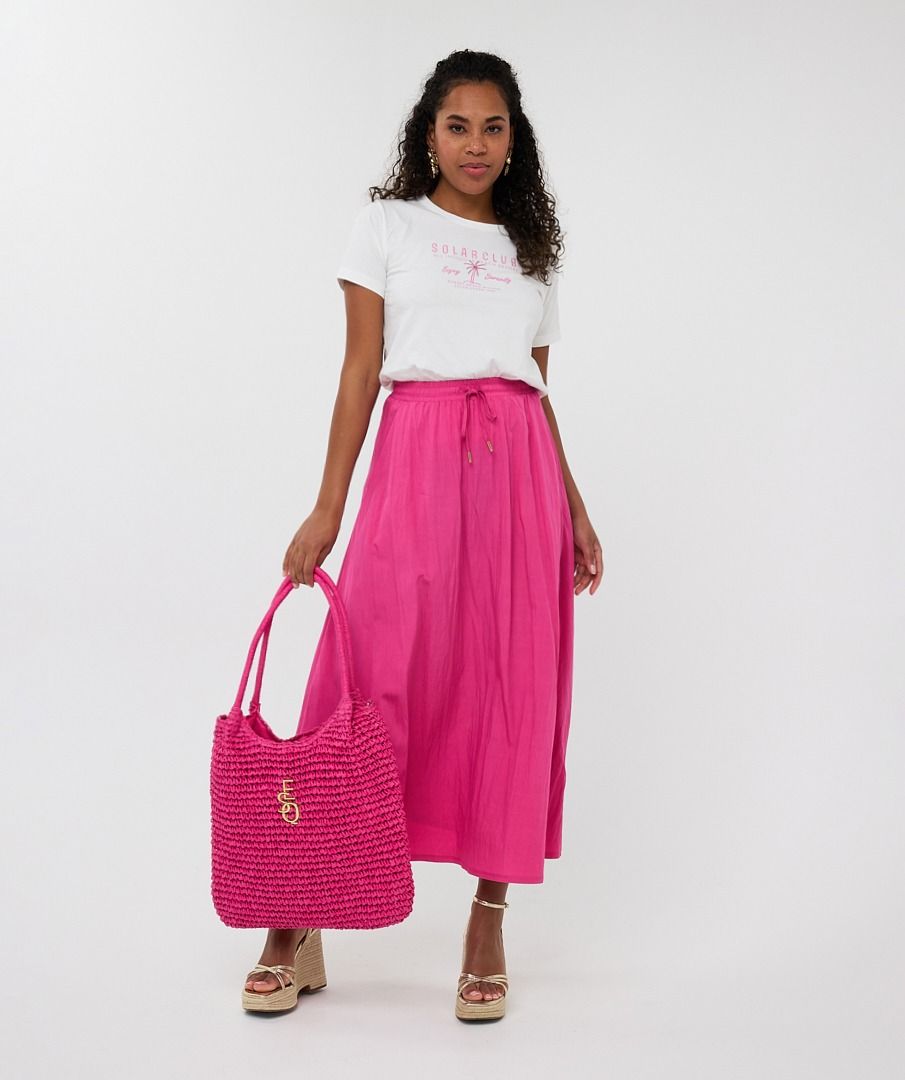 The EsQualo Bodil Bag is a chic and versatile handbag featuring two carrying options—a long adjustable strap with the EsQualo name for a stylish crossbody look, and shorter handles for a classic hand-carry option. Designed for both fashion and function, this bag adds a bold pop of hot pink to any outfit while offering plenty of room to carry all your essentials.