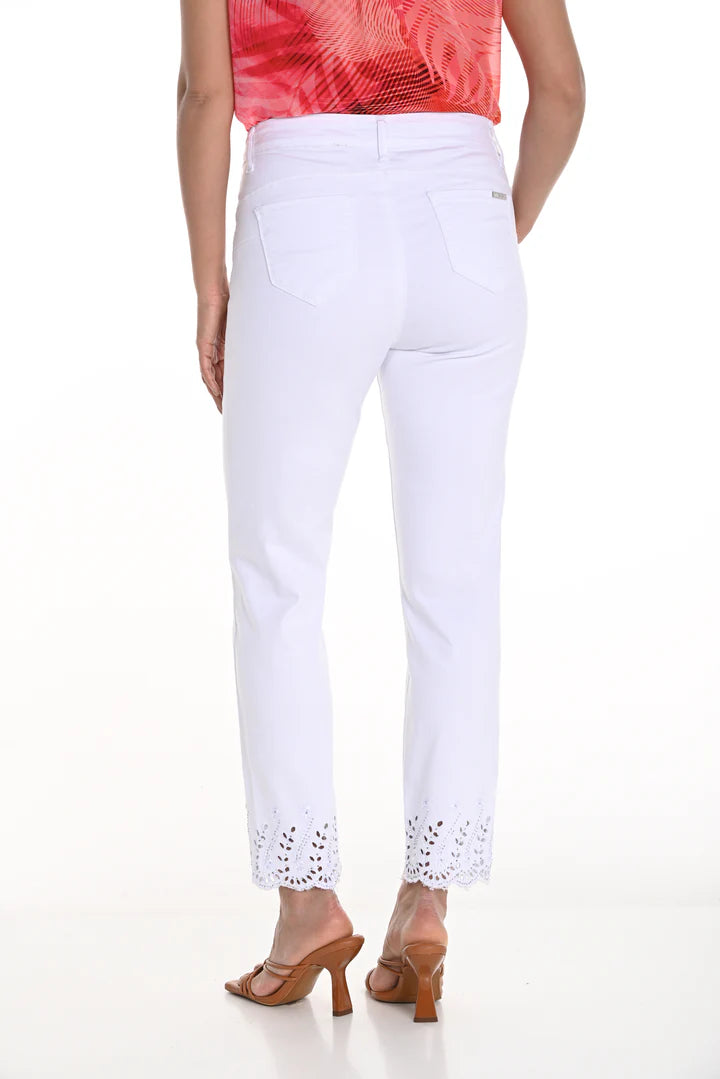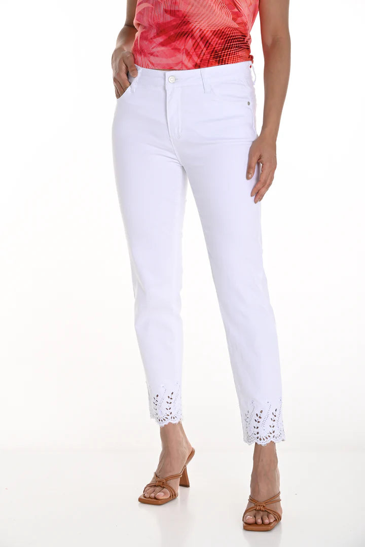 The Frank Lyman Pant is a timeless addition to any wardrobe, blending sophistication and comfort effortlessly. Designed with a soft off-white hue, these pants exude elegance, making them perfect for any occasion. The Onike features a beautifully detailed hem that adds a touch of elegance and sophistication. The ankle-length design is enhanced with intricate embroidery and cut-out accents, creating a refined yet modern aesthetic. Adding to its charm, the hem is adorned with subtle sparkle embellishments, offering a hint of shimmer that catches the light gracefully. This delicate detail elevates the pants, making them perfect for both casual and dressy occasions.