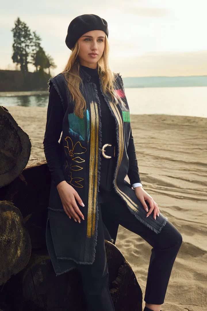 Make a dramatic entrance in this artistic woven vest by Frank Lyman. The Black/Multi palette delivers eye-catching contrast through a vibrant abstract print, while the flowing silhouette invites movement and intrigue. Whether layered over sleek essentials or styled as a statement piece, this vest transforms any outfit into a gallery-worthy ensemble — effortlessly wearable, endlessly expressive.