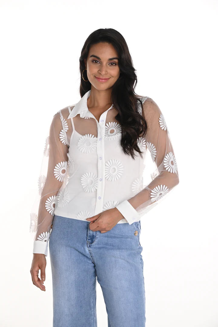 The Frank Lyman Kora Knit Top with Cami is a stylish piece featuring a delicate floral mesh design, adding a touch of romance and sophistication to your wardrobe. The Kora includes a comfortable cami for coverage while maintaining its airy elegance. Perfect for pairing with jeans or skirts, this versatile top transitions seamlessly from casual outings to dressy occasions.