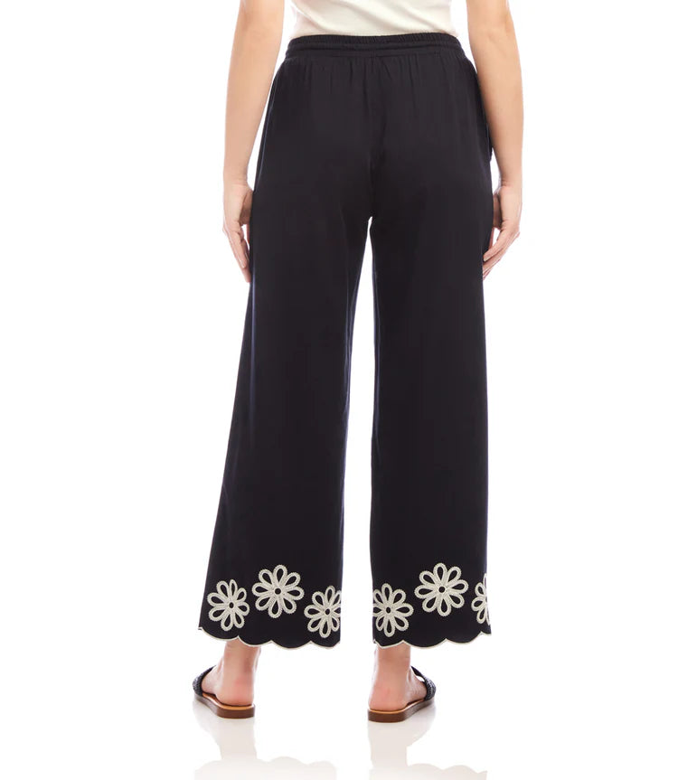 • Load image into Gallery viewer, Refined yet effortlessly comfortable, the Sherrit Scallop Drawstring Pants by Karen Kane blend elegance with everyday ease. Crafted from black cotton woven fabric, these wide-leg pants feature delicate cream embroidery and a scalloped hem. Perfect for casual outings, workdays, or evening wear, these versatile embroidered pants pair beautifully with blouses, tanks, or structured tops.