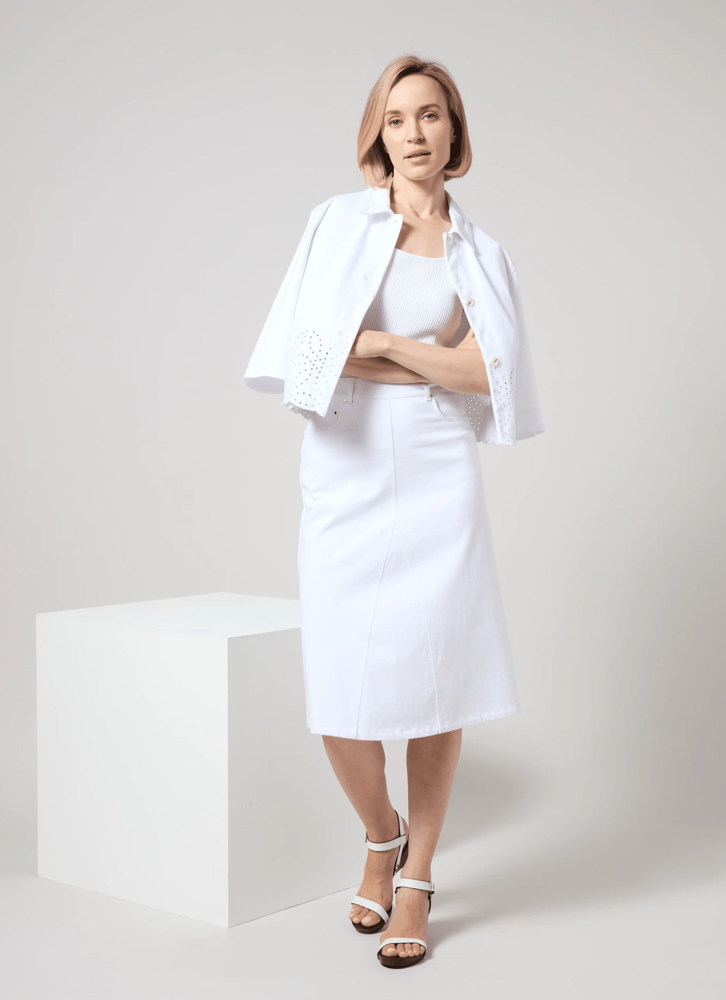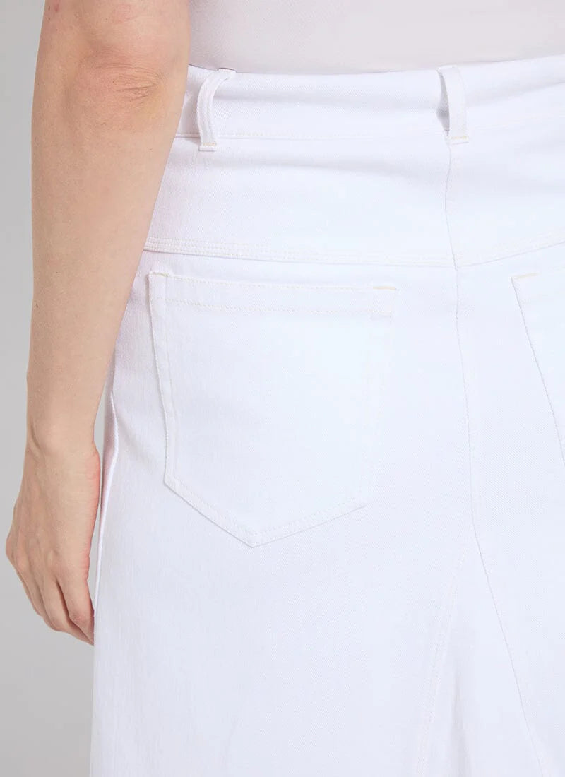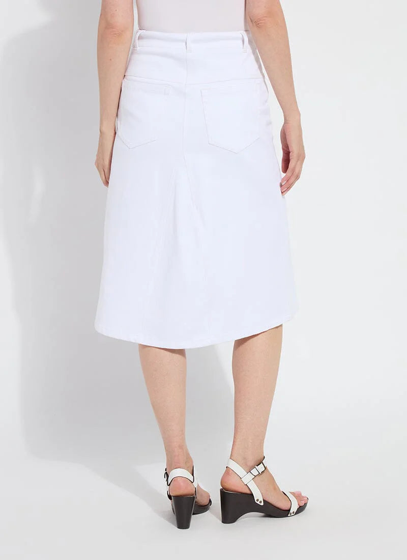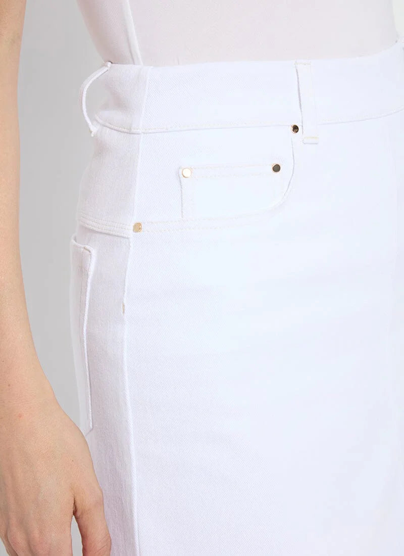 Effortlessly stylish, the Bellamy Denim Skirt is designed with an on-trend A-line flare silhouette, combining comfort and chic fashion. This skirt features faux front pockets, belt loops with rivet details, back patch pockets, and a classic V insert for added flair. Crafted from premium 4-way stretch Knit Denim, the Bellamy offers a below-knee length and unlined design with a concealed patented waistband for a sleek fit. With its easy pull-on styling, this versatile piece is perfect for creating a variety of polished looks.