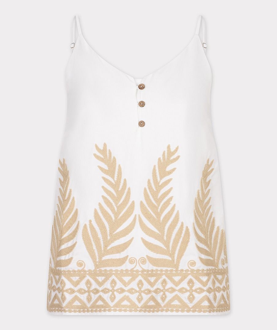 The EsQualo Clady Camisole is a stunning piece designed for effortless elegance. This embroidered camisole features a delicate leaf pattern interwoven with shimmering iridescent lurex, adding a touch of sophistication. The playful wooden buttons and adjustable straps ensure a comfortable and customizable fit. This lovely top, on its own or under a jacket, offers a lightweight and breathable feel, perfect for warm-weather styling.